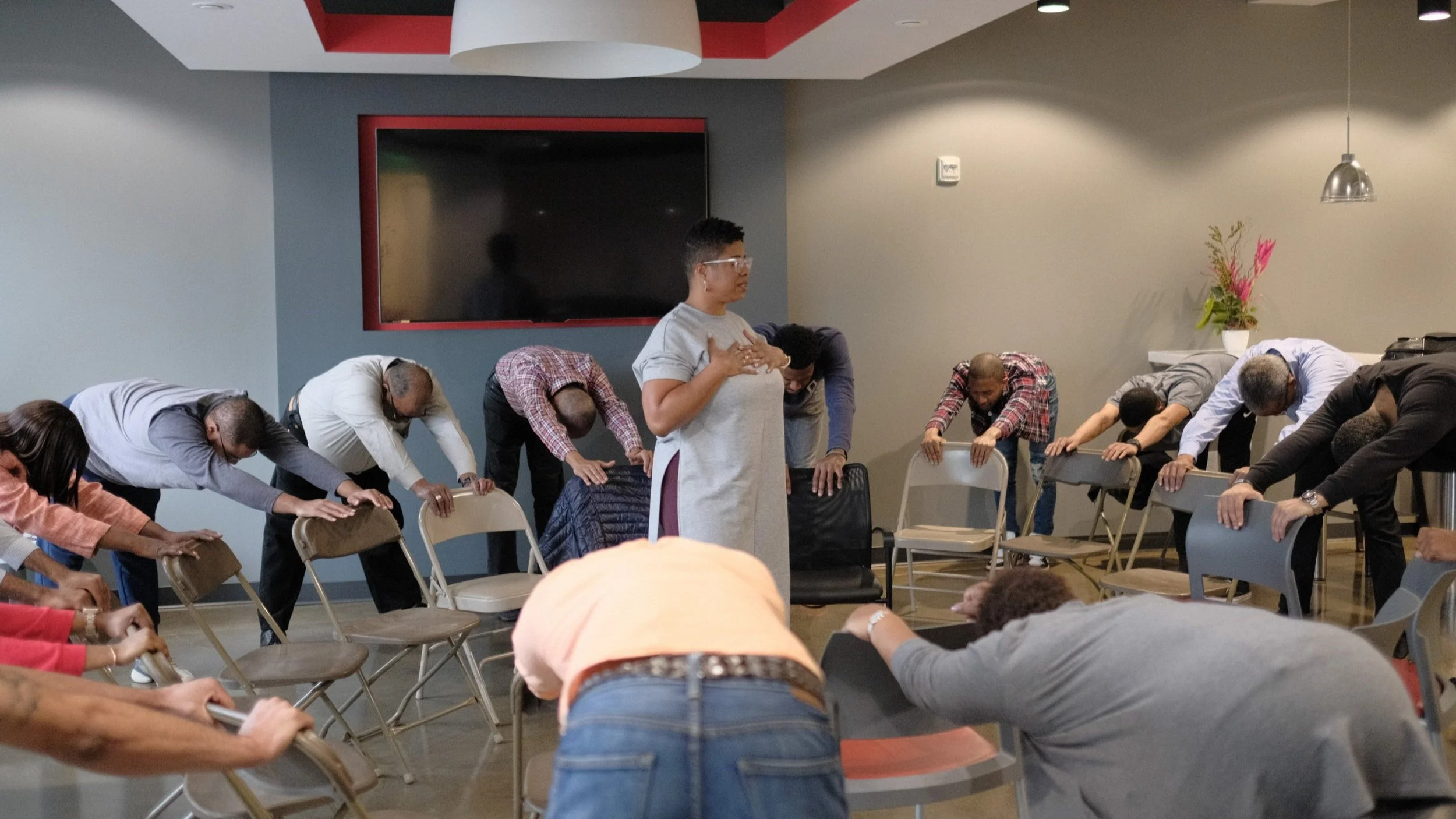 Charisse standing in the center of a circle while T. Dallas Smith team members stretch holding onto the backs of chairs.