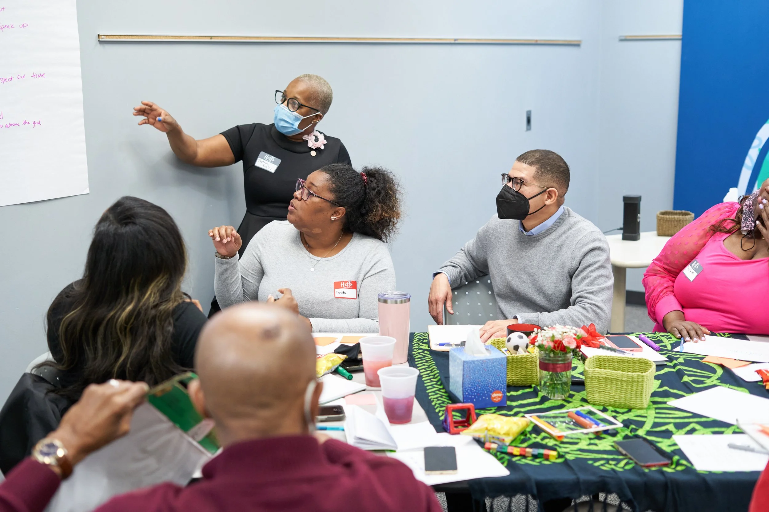 Photo: Charisse standing at white board laughing during team building retreat with Sheltering Arms.